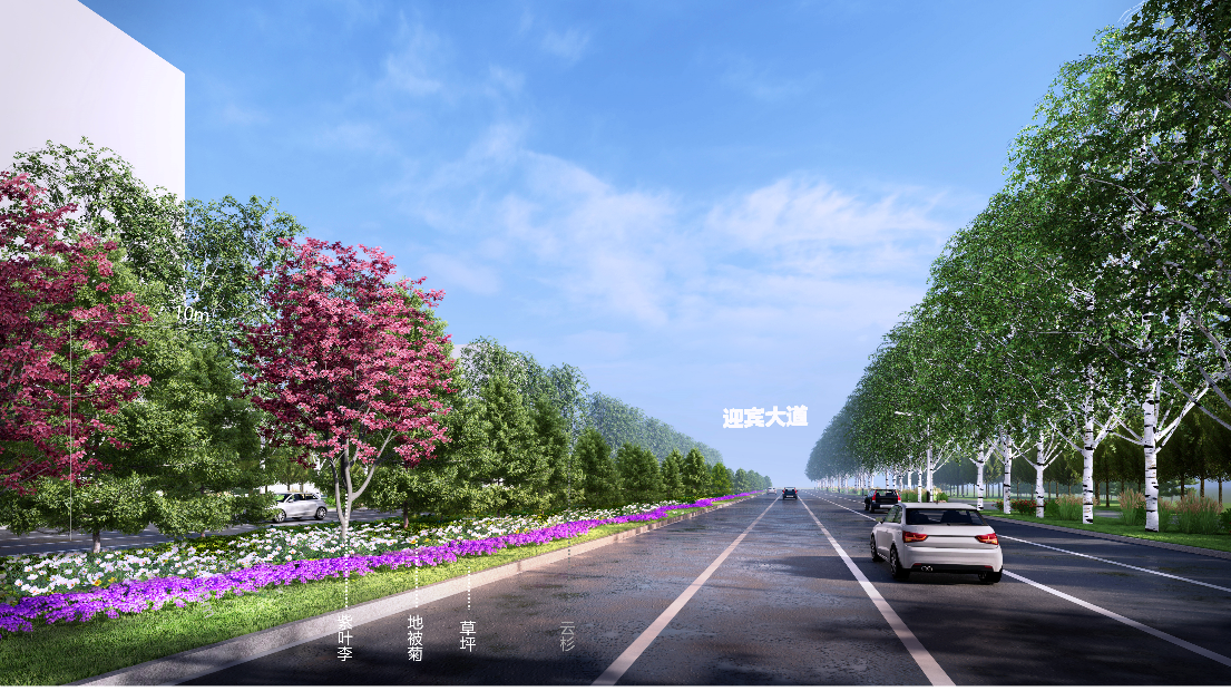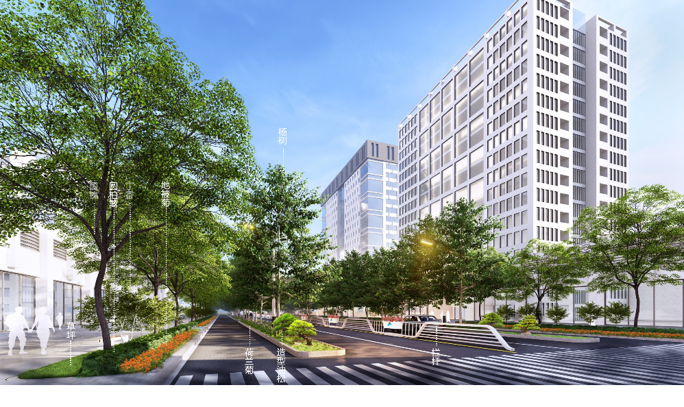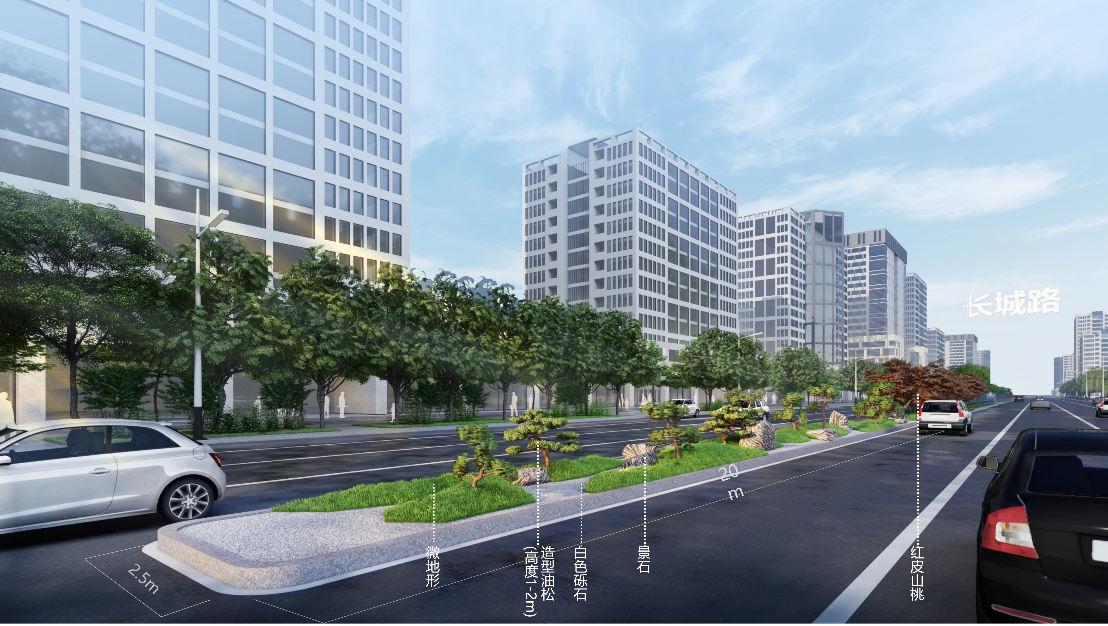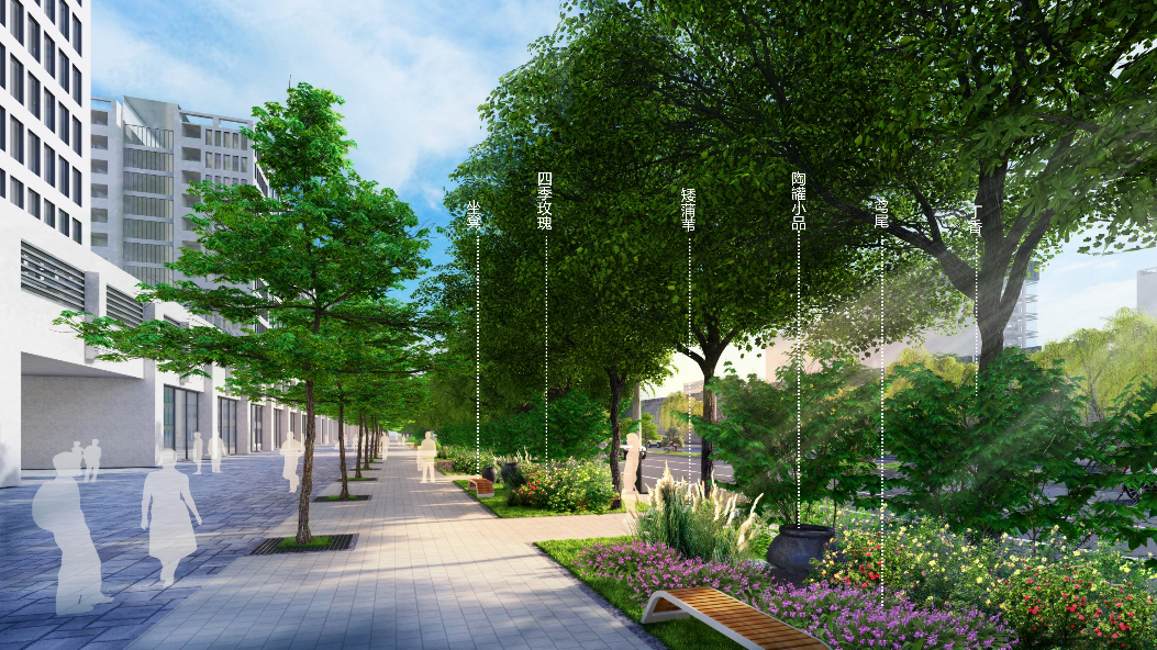第一,因地制宜选取植被种植结构,结合街道功能分区打造适配性绿化布局。根据道路中分带、道路端头、人行道等不同功能区域的空间尺度、使用场景与景观需求,进行针对性的种植结构设计。在项目中对于道路中分带,结合宽度打造多层次绿化,中分带内搭配紫叶李、地被菊、云杉与草坪,兼顾隔离功能与景观层次;中分带端头则以造型油松搭配微地形、白色砾石与红皮山桃,实现小空间的精致化绿化。人行道绿化则注重实用性与体验感,人行道以金叶榆为上层乔木,搭配藤本月季、胶东卫矛与花架,打造兼具遮阴与观赏价值的步行空间;也可配置黑心菊、南天竹、狼尾草等植物,搭配景石、芦苇灯与微地形,让步行体验与自然景观深度融合。在各类街道绿化设计中,均重视灌木与草本的应用,弥补单一乔木绿化的层次不足,提升整体应激恢复效果。