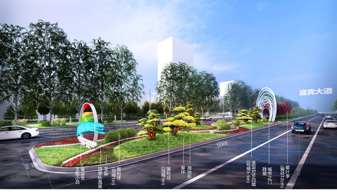第三,打造“功能性绿化-公共空间互动”的复合型街道场景,实现绿化疗愈功能与公众使用需求的深度融合。街道绿地的优化并非单纯的植物配置,而是要打破绿化与公共空间的边界,让绿化成为连接公众日常活动的纽带,通过绿化与公共设施、景观小品的结合,提升公众与绿化的互动性,进一步强化应激恢复效果。在项目中结合街道空间打造兼具绿化与休闲功能的复合型区域,如以圆柏球、造型对节白蜡、紫叶李等打造基础绿化景观,搭配省运动会主题小品、城市之门雕塑等景观节点,同时设置玉簪、四季秋海棠等观赏草本,让绿化区域成为城市文化展示与视觉观赏的结合体。通过在绿化空间中融入座椅、条石坐凳、异形绿池等休闲设施,搭配丛生白蜡、国槐、朝鲜黄杨球等植物,打造可供公众休憩、交流的绿色休闲空间;还通过陶罐小品、景石等景观元素,结合四季玫瑰、矮蒲苇、鸢尾等草本植物,打造小型口袋绿地,满足周边居民的日常休闲需求。此类复合型街道场景,让街道绿化从单纯的“景观绿化”转变为“功能绿化”,既保留了绿化的身心疗愈属性,又提升了城市公共空间的利用效率,让公众在日常活动中更易接触自然、缓解压力。