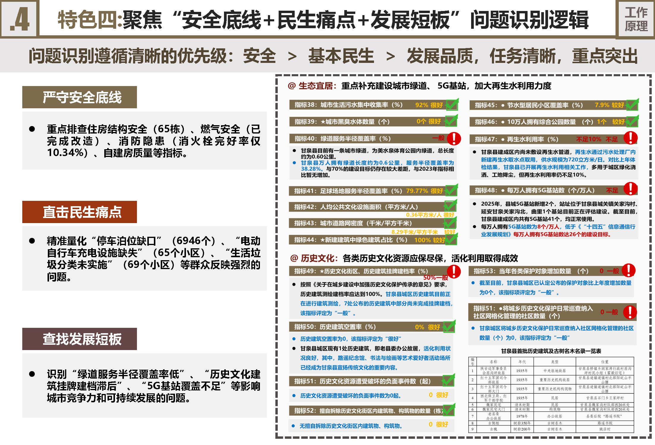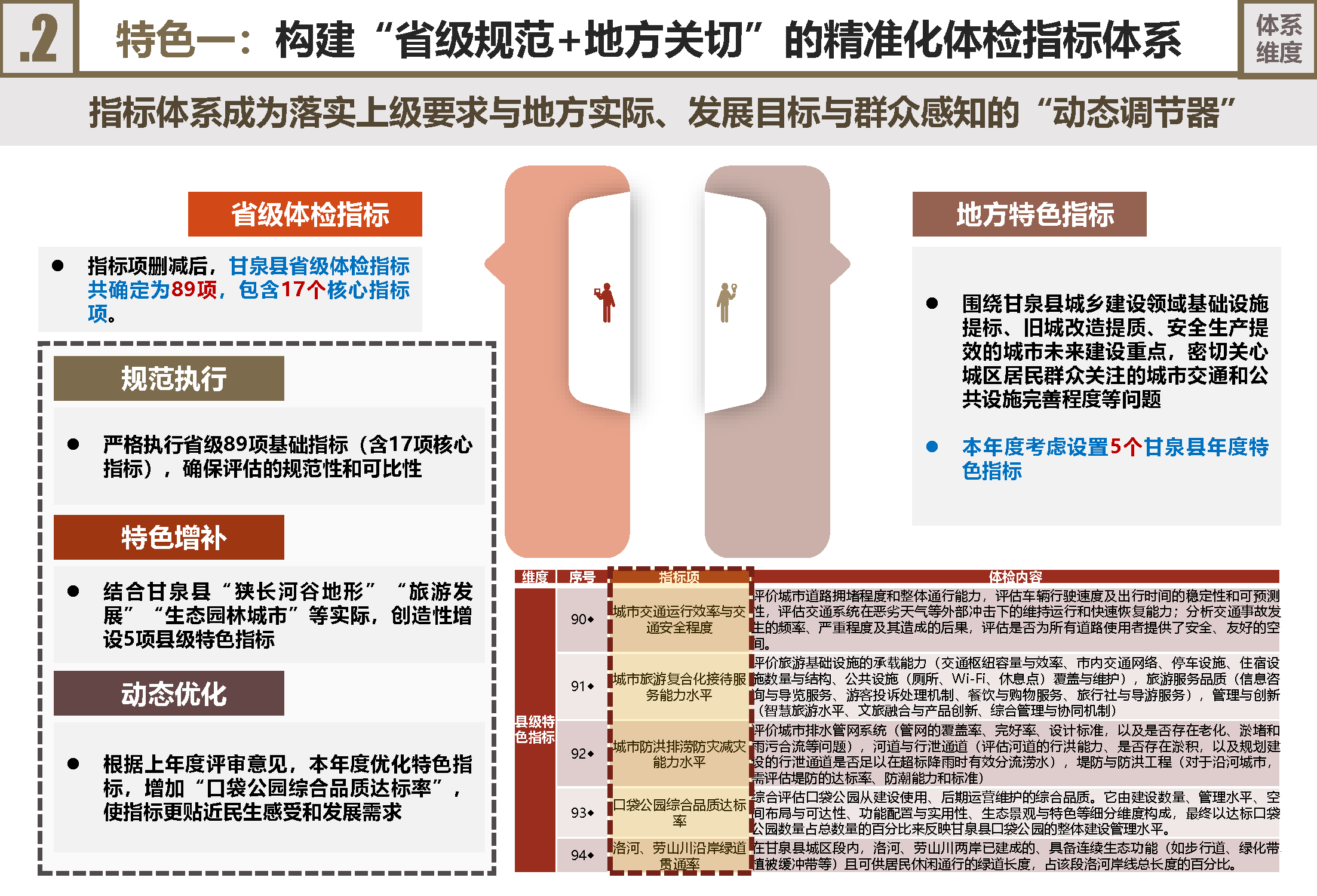 构建“规范+特色”指标体系:指标体系进行了本土化创新。严格执行省级89项基础指标(含17项核心),确保规范性与可比性,守住安全与民生底线。同时,创造性增设5项县级特色指标,紧扣甘泉县“狭长河谷地形”、“生态园林城市”建设和旅游发展实际,如“城市防洪排涝能力”、“口袋公园品质达标率”、“洛河劳山川绿道贯通率”,使体检紧密服务地方发展目标。