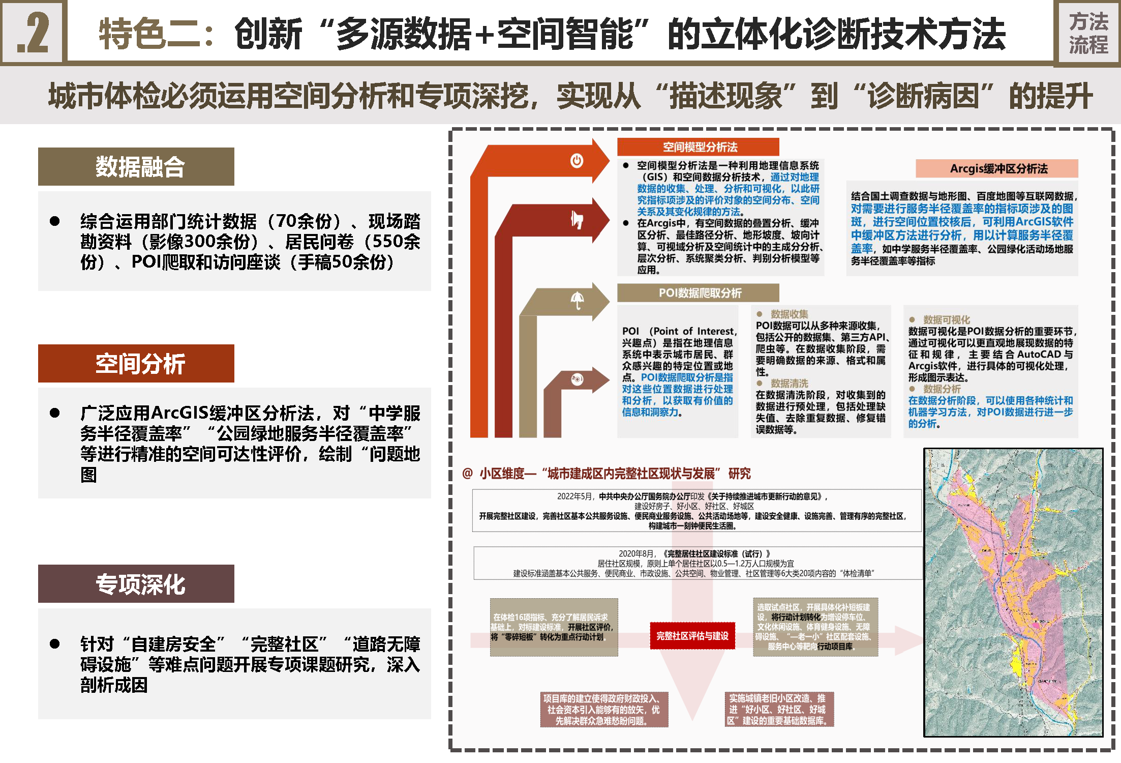 应用“多源数据+空间智能”诊断方法:采用多源数据融合与空间分析技术。整合部门数据、现场踏勘、居民问卷(550余份)、POI及访谈资料,构建立体数据基础。广泛应用ArcGIS空间分析(如缓冲区分析),对公共服务设施覆盖率等进行精准的空间可达性评价,绘制“问题地图”。针对“自建房安全”、“完整社区”等难点开展专项课题,深入剖析成因。