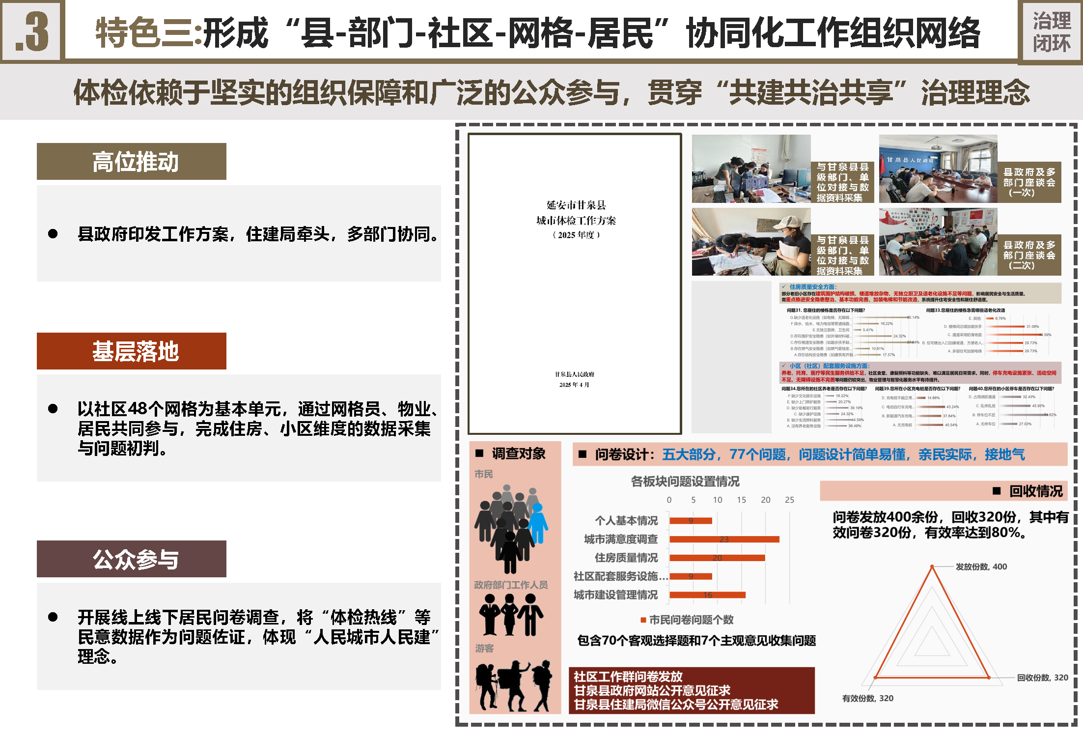 形成“多元协同+公众参与”组织网络:建立“县—部门—社区—网格—居民”协同体系。县政府高位推动,住建局牵头,多部门协同。以48个社区网格为单元,发动网格员、物业、居民参与数据采集。通过设计77个接地气问题的居民问卷及开设“体检热线”,广泛收集民意,将群众感知作为问题识别的重要依据。