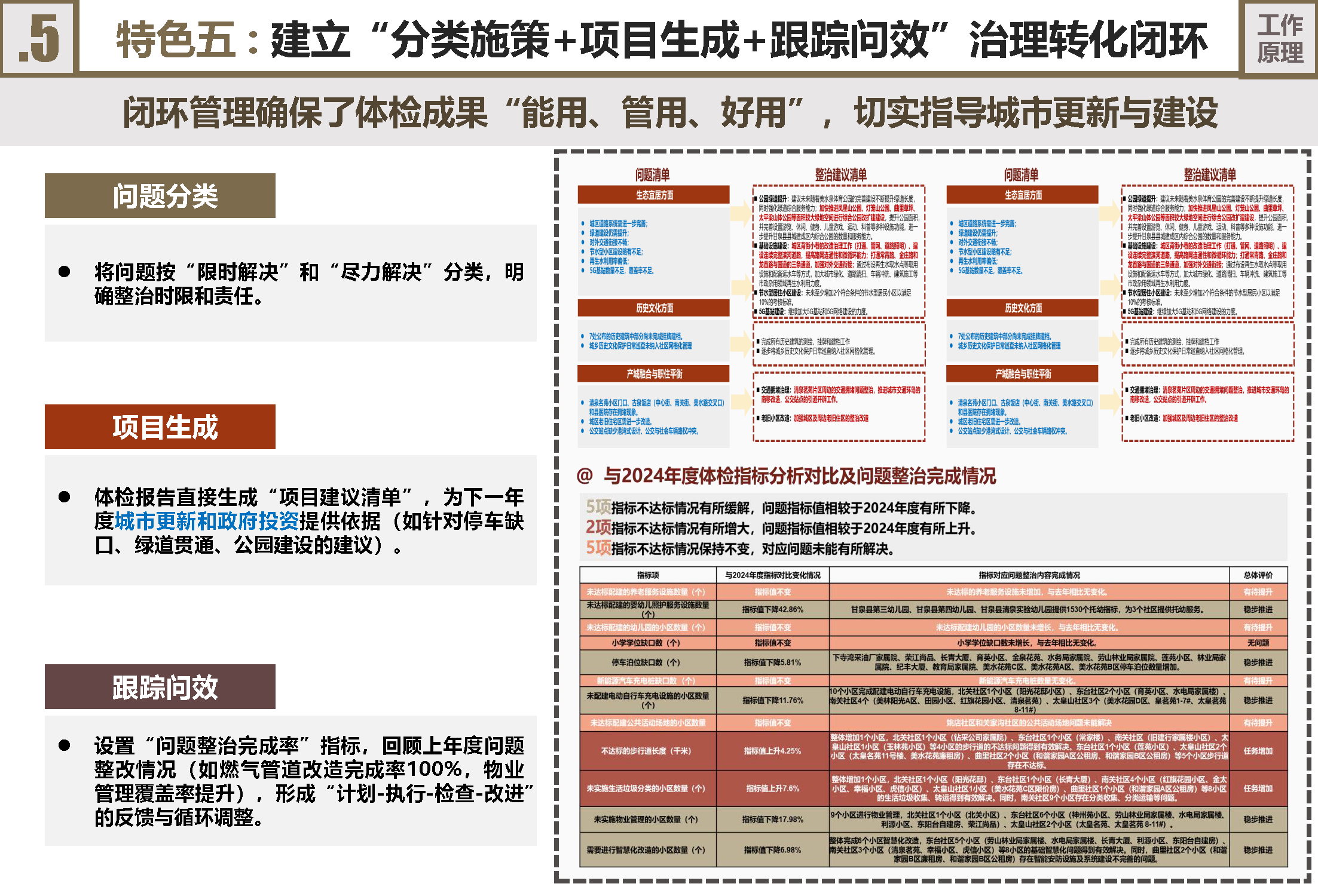 建立“分类—项目—跟踪”治理转化闭环:确保体检成果落地。首先,将问题按“限时解决”和“尽力解决”分类定责。其次,报告直接输出“项目建议清单”,指导次年更新与投资计划。最后,设置“问题整治完成率”指标,在次年度体检中跟踪复核,形成“计划-执行-检查-改进”的PDCA闭环。对比显示,婴幼儿照护设施、停车泊位、电动充电设施、物业管理覆盖率等问题得到稳步缓解。