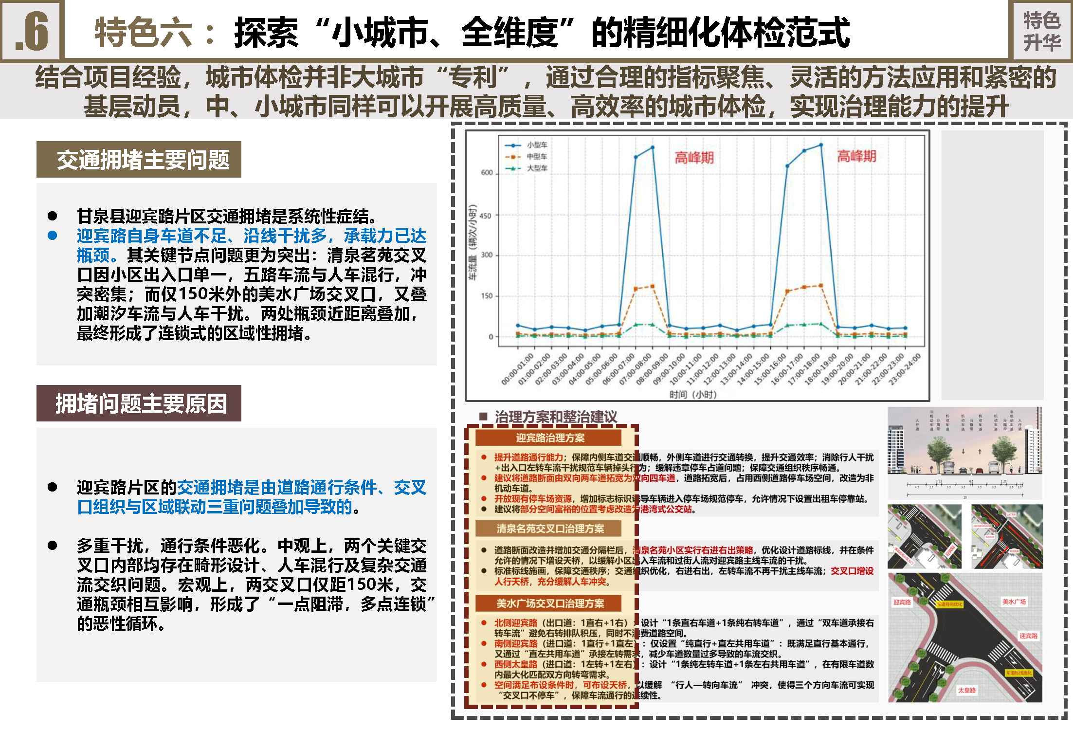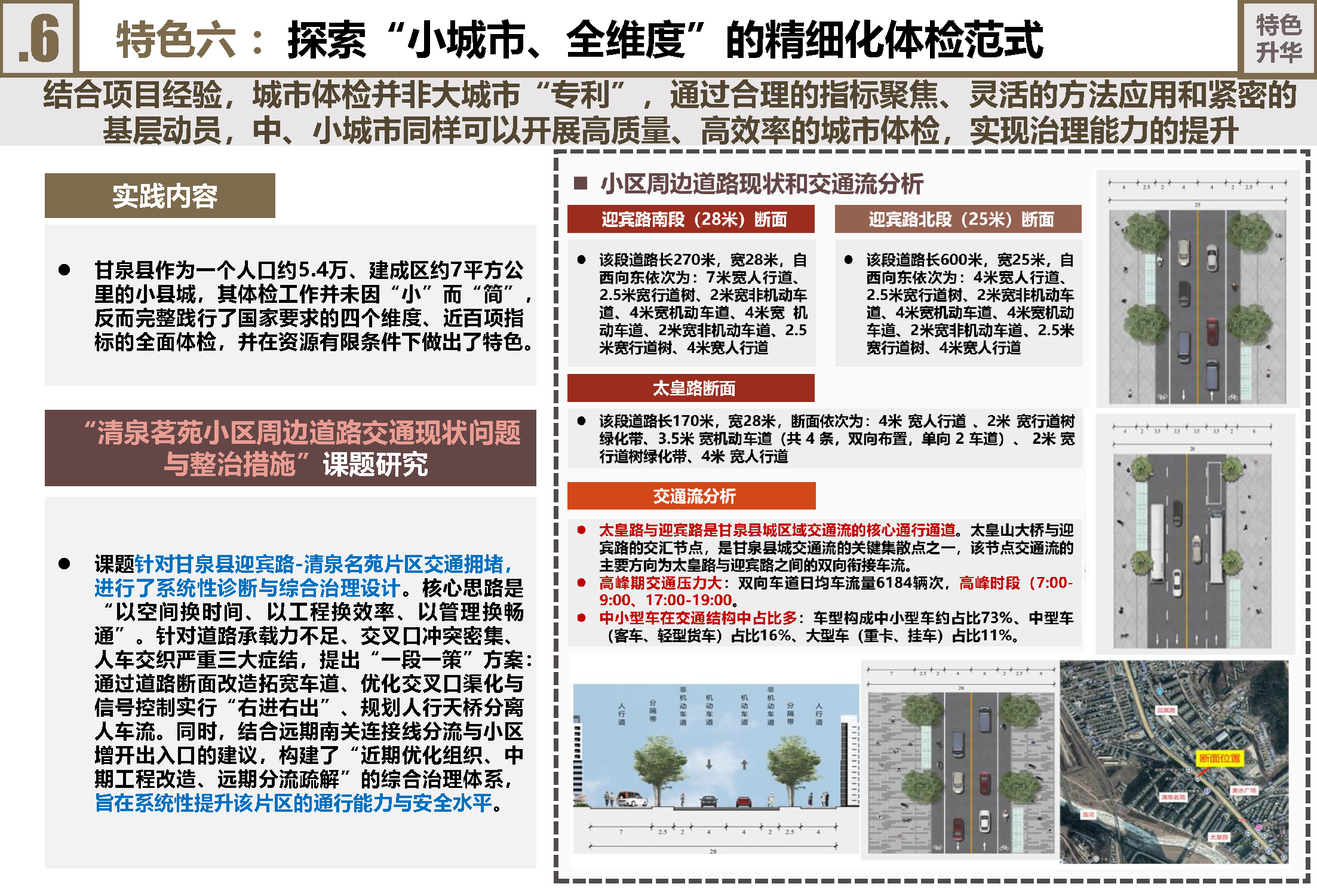 探索“小城市、全维度”精细化体检范式:甘泉实践证明体检非大城市“专利”。这个建成区约5平方公里、人口约5.4万的县城,完整践行了四个维度近百项指标的全面体检,并在资源有限下做出特色。例如,针对“清泉茗苑片区交通拥堵”开展专项研究,通过交通流分析和空间设计,提出“一段一策”综合整治方案,为中小城市提供了宝贵的“甘泉经验”。