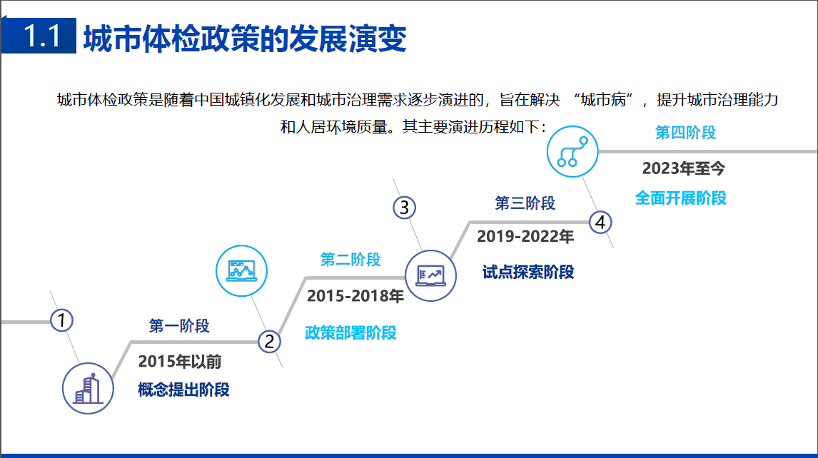 在政策发展上,城市体检历经四个阶段:2015 年前为概念提出期,从规划实施评估逐步走向法定化,2011 年首次提出 “城市体检评估” 概念;2015-2018 年进入政策部署期,确立 “一年一体检、五年一评估” 机制;2019-2022 年为试点探索期,以中央文件明确制度框架与政府职责;2023 年至今步入全面开展期,在地级及以上城市全覆盖,形成 “先体检、后更新,无体检、不更新” 的工作共识,成为城市规划建设管理的核心抓手。