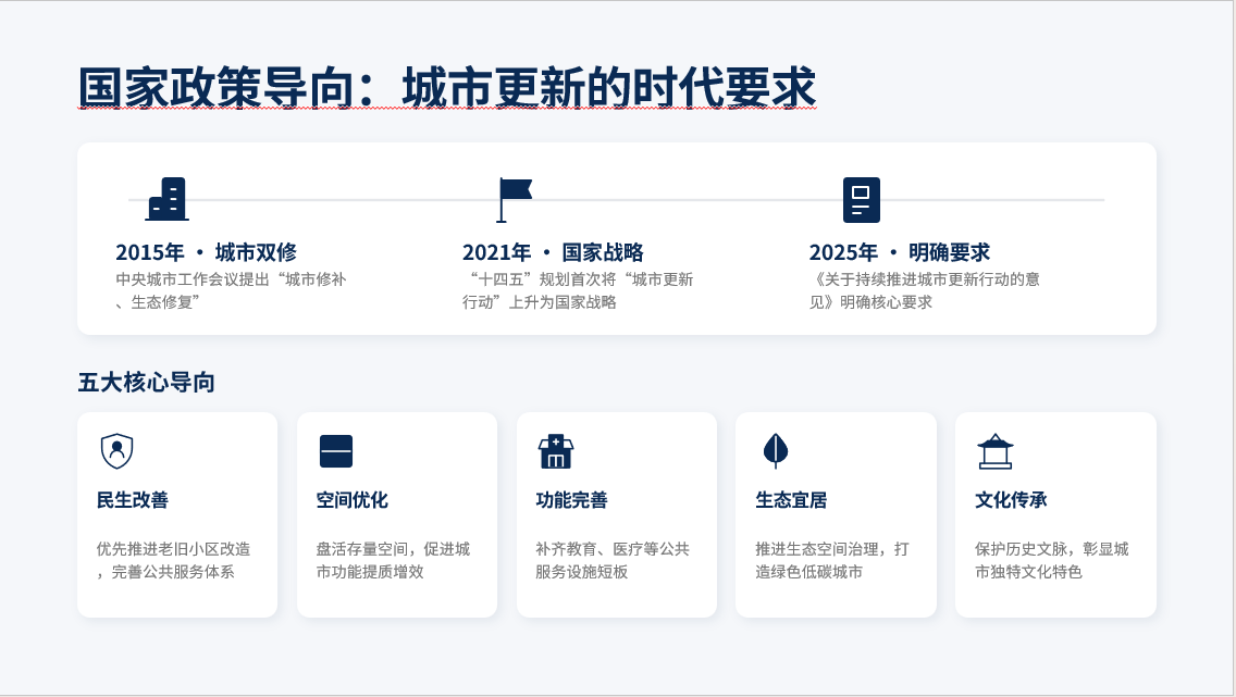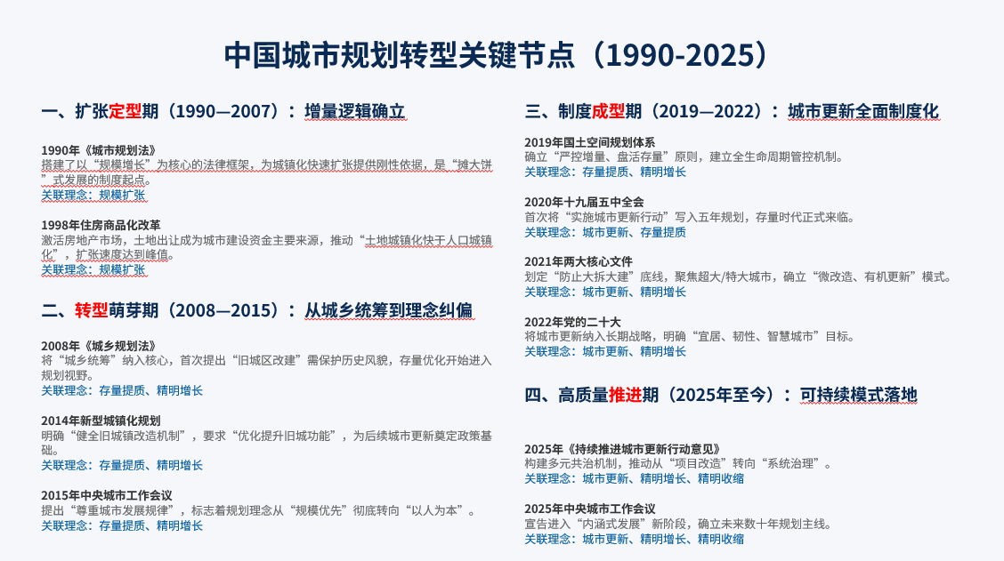 在背景与挑战层面,我国城市规划已从规模扩张转向存量提质、精明更新,城市更新成为国家战略。铜川作为因煤而兴的资源型城市,面临五大发展困境:空间结构失衡、产业转型滞后、民生设施短板突出、生态修复任务艰巨、特色资源转化不足,城市更新迫在眉睫。
