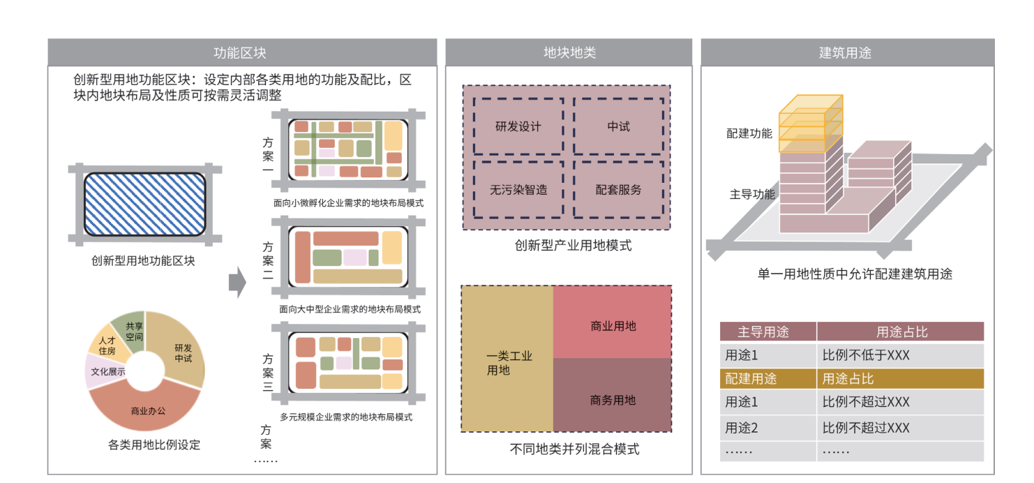 例如,随着产业的不断升级与类型变化,多主体、复合化的创新链组织模式将取代原有单一主体独立化、封闭式的模式。以创新为主要驱动的小型化、定制化、多样化的生产形式,使得中小企业成为主要创新载体。随着创新项目逐渐复合化、精细化,单一地块开始承载多样化功能需求的建筑,促使在原先城市功能分区逻辑下设定的一个地块对应一个细分地类的功能管控模式,与创新型和复合型产业的需求形成错配。市场逻辑的转变将对控规的土地功能管控提出多样化要求,多元化、高弹性的空间将更适合创新型经济的发展需要。