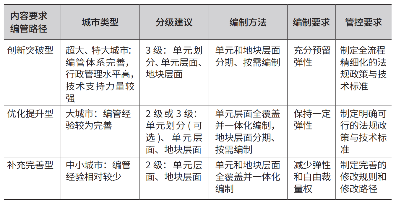 因城市的规模和发展阶段不同,其所急需解决的问题也有所差异。面向实施层面的高质量发展要求,详细规划需要协调统筹多部门,管理流程较为复杂,与之匹配的法规政策和技术标准要求高。因此,需要统筹考虑原有详细规划的编管基础,以及地方经济发展水平、行政管理能力、技术支持力量的差异,因地制宜地制定与事权管理能力匹配的编管路径。一般而言,行政管理能力和技术支持力量越强的城市可制定更加精细化的编管路径,结合不同层级事权管理需求,上层级可为下层级预留充分弹性,适当增加“自由裁量权”,以实现分层、分类精细化和动态化管控。反之,应制定更加精简的编管路径,明确各层级的传导路径和管控要求,减少弹性预留和“自由裁量权”。编管路径可大概分为创新突破型、优化提升型和补充完善型3种类型(表2)。