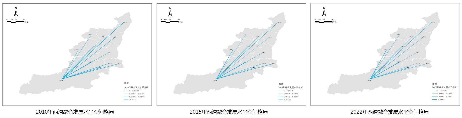 研究构建包含空间、交通、产业、公服、生态、政策六大维度、24项指标的融合发展评价体系(见图2),采用全局熵值法进行量化评估。结果揭示了西渭融合发展水平总体稳步提升,但区域差异显著,在空间上呈现“核心—边缘”结构(见图3)。